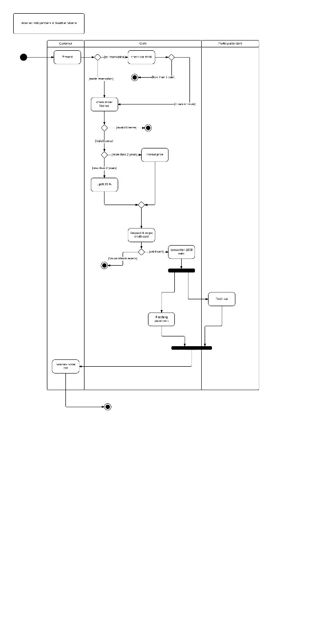 De klant wil een auto huren. Hiervoor moet hij naar een autoverhuurder gaan. Deze verhuurder zal vervolgens controleren of hij een reservatie heeft gemaakt. Heeft hij geen reservatie gemaakt dan controleert de verhuurder hoeveel auto's ze nog in beschikbaar hebben. Hebben ze minder dan 3 wagens beschikbaar dan zal de klant niets kunnen huren. Als ze 3 of meer auto's beschikbaar hebben dan staan we verhuur zonder reservatie toe. Daarna zal de verhuurder het rijbewijs van de klant controleren of dit wel heldig is. Dit geldt ook als de klant een reservatie op voorhand heeft gemaakt. Bij het controleren van het rijbewijs wordt er gekeken of de persoon al meer dan 2 jaar zijn rijbewijs heeft. Heeft de persoon zijn rijbewijs al 2 jaar of langer blijft het prijzentarief onveranderd, zoniet wordt het prijzentarief met 30% verhoogd. Vervolgens wordt er aan de klant gevraagd om een bedrag van 1 000 euro te betalen met de credit kaart. Kan je het bedrag niet betalen dan gaat de verhuur van de auto niet door. Nadat dit alles in orde is gebracht zal de verhuurder het resterende papier werk in order brengen. Op dit zelfde moment zal de parkeerbediende de wagen halen. Als deze beide zaken afgerond zijn kan de klant vertrekken met de auto.
